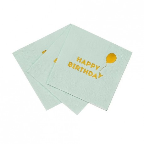 Aggiungi un tocco speciale alla festa di compleanno con questi splendidi tovagliolini verde menta decorati con la scritta Happy Birthday e un palloncino in foil oro.